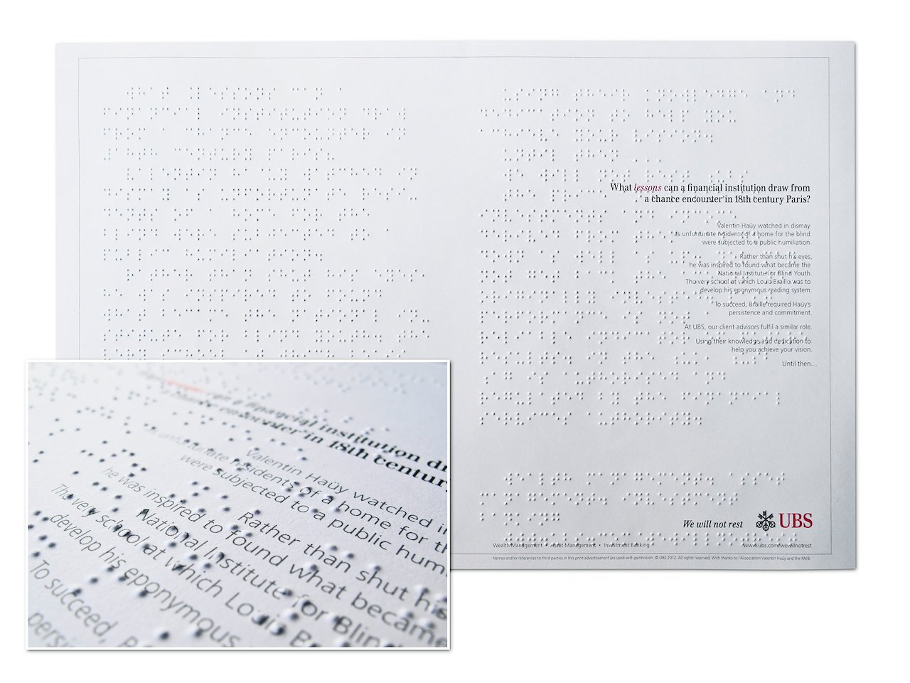 This insert, written in both Braille and sighted text, appeared in 800,000 copies of The Economist. It tells the story of Valentin Haüy, founder of the school for the blind where Louis Braille developed his eponymous reading system.